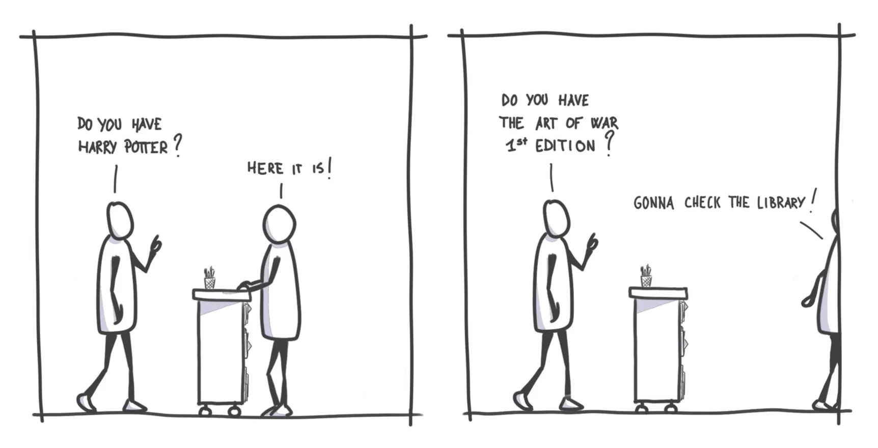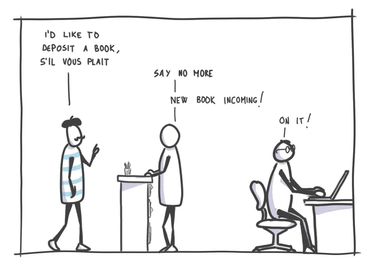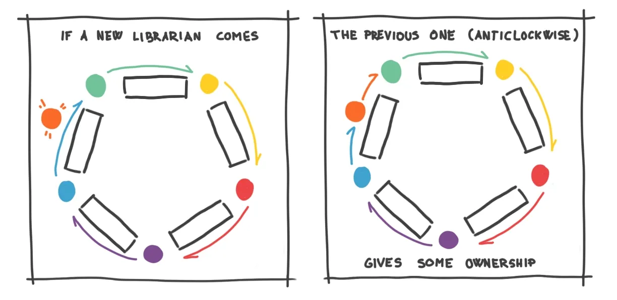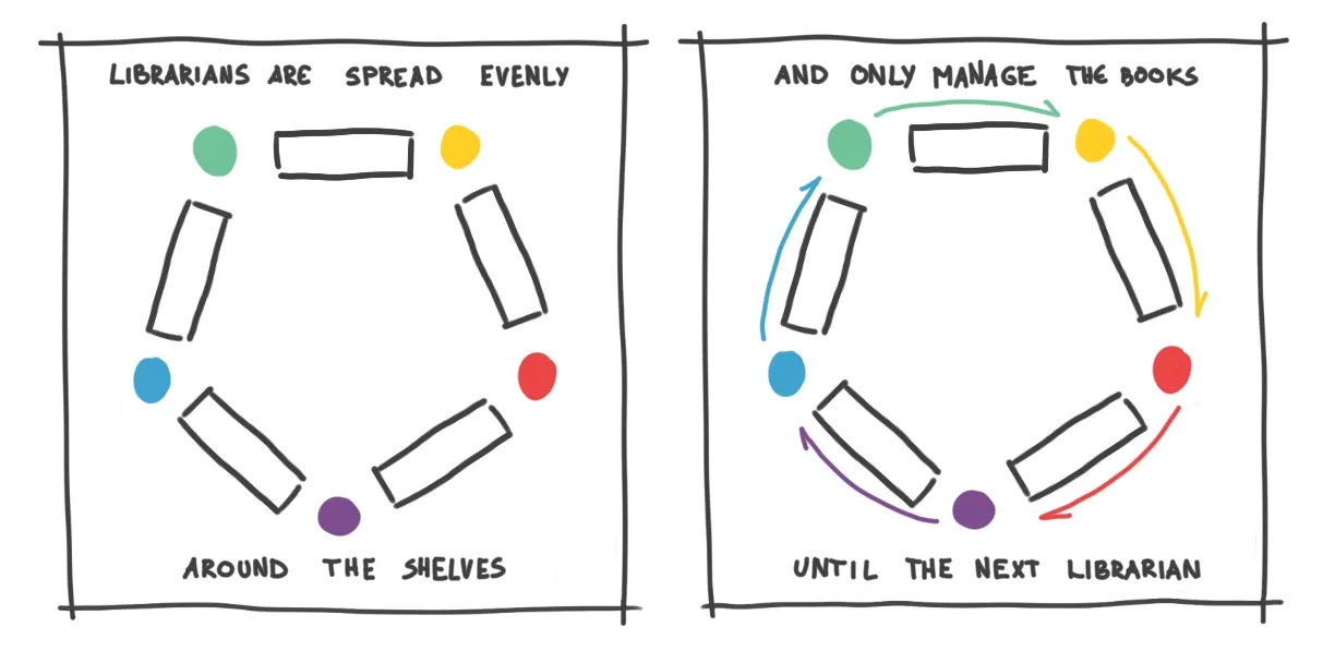 Librarians also have their own portable bookshelf, where they store copies of only the most requested books. This way, they have to check the big library only when they don’t have a book readily available.